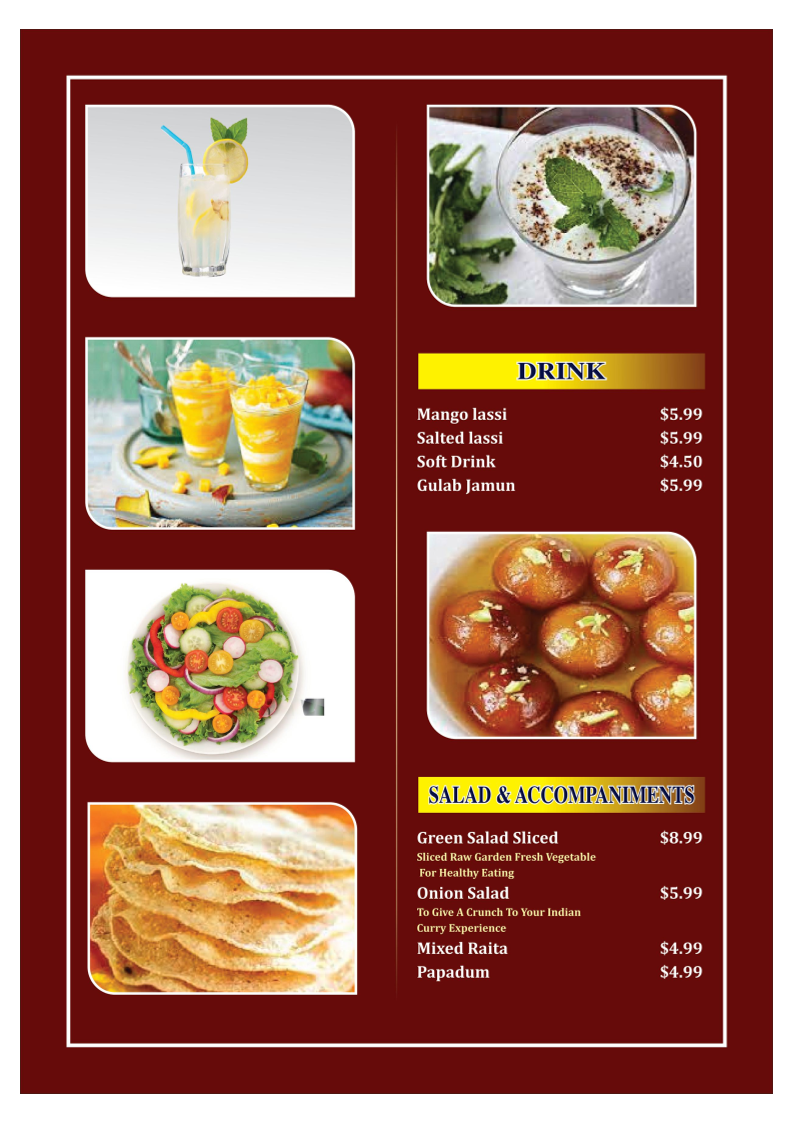 Salads at The Lucky Dhaba are simple yet refreshing, with options like Green Salad Sliced and Onion Salad. The Mixed Raita and Papadum offer a cool and crunchy contrast to the bold flavors of the mains.