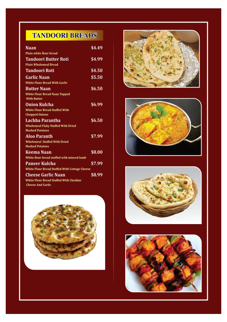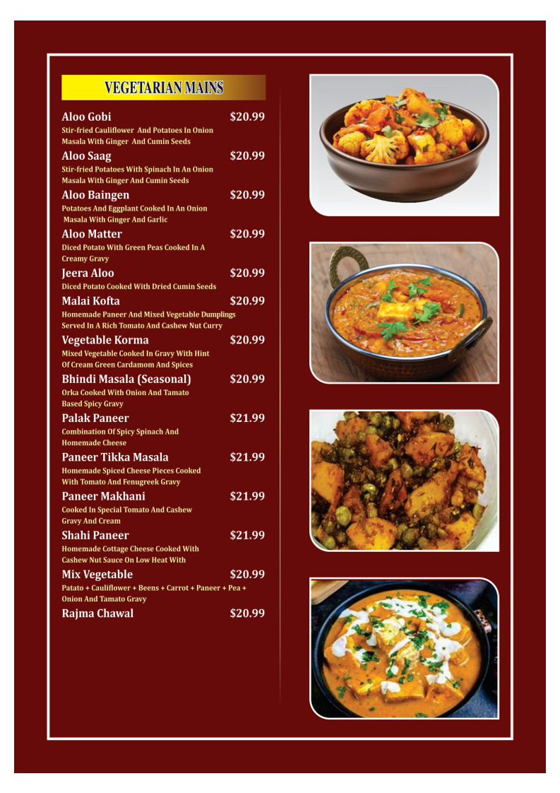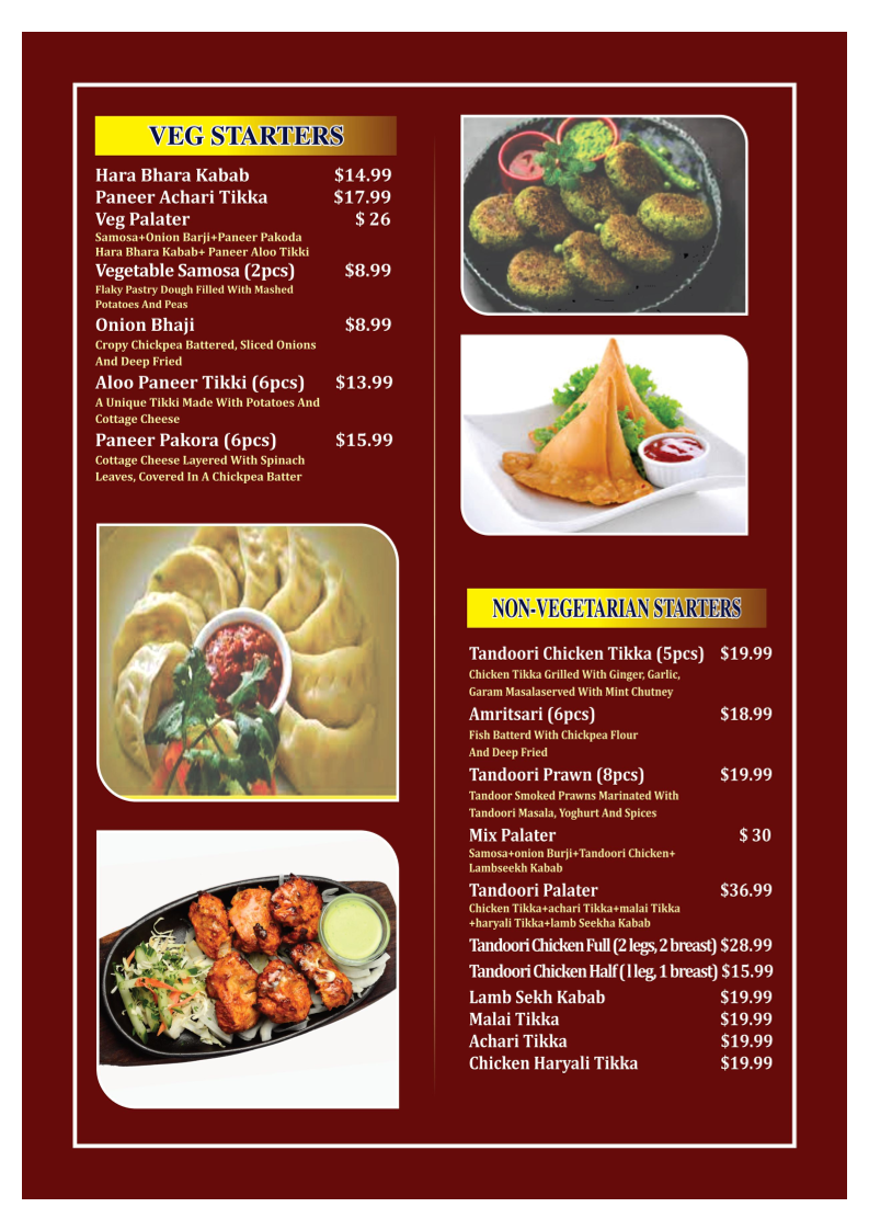 For those craving appetizers, the restaurant provides a range of starters including crispy Spring Rolls, savory Lamb Seekh Kebabs, and the flavorful Tandoori Paneer Tikka. Other options such as Aloo Paneer Tikki and Chicken Achari Tikka provide a rich, aromatic taste, while the Lamb Seekh Kebabs stand out for their bold flavors.