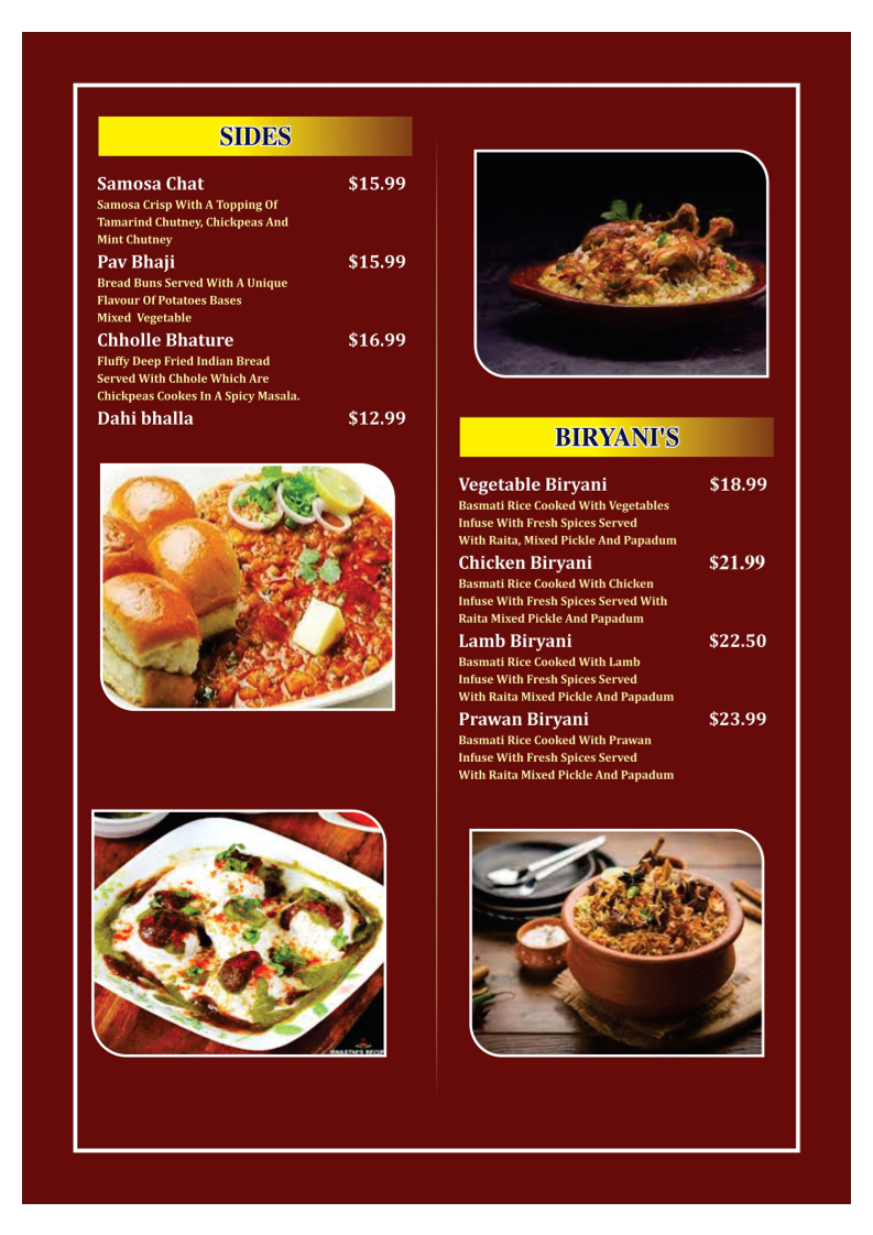 When it comes to sides, Pav Bhaji, Chole Bhature, and Samosa Chaat are perfect companions to any meal. To complement the rice, you can choose from Vegetable Pulao, Jeera Rice, or Plain Basmati Rice.