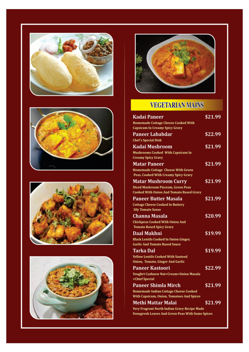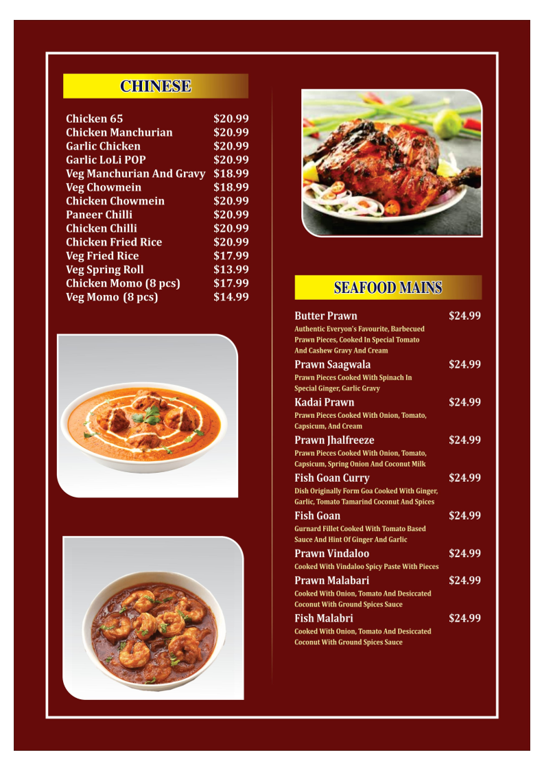 If you’re in the mood for something with a Chinese twist, the Chinese Tarka section provides favorites like Chicken Chilli and Veg Chow Mein, as well as Veg Fried Rice and Veg Manchurian & Gravy.