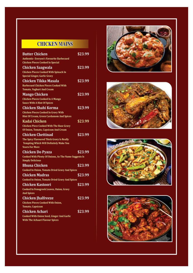 Cooked with ginger, garlic and brown onion gravy. Finished with yoghurt herbs and spices.