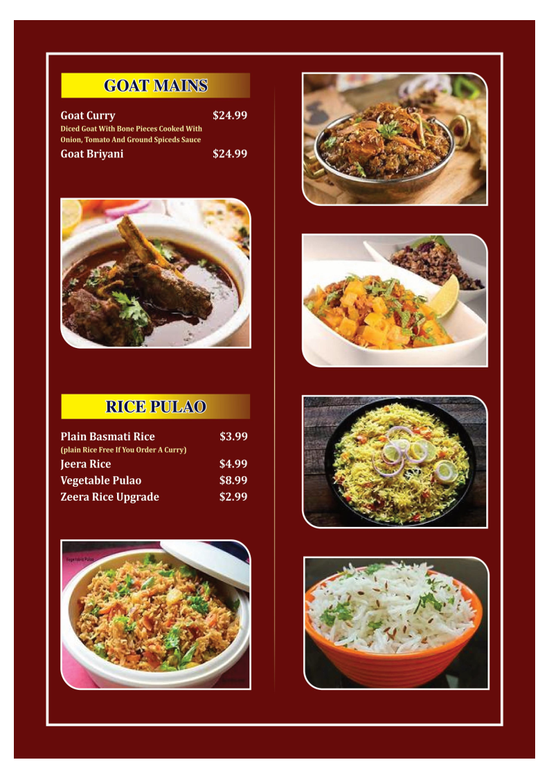 For a more filling option, the Biryani range is exceptional, featuring dishes like Vegetable Biryani, Prawn Biryani, Chicken Biryani, and even Goat Biryani for meat lovers. Lamb Biryani completes the list, delivering a mix of fragrant rice and tender meat.
